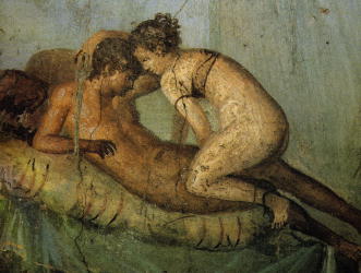 En plus d'être splendides, les fresques pornographiques de Pompéi constituent un passionnant sujet de réflexion. Elles sont en effet partiellement responsables de l'image hédoniste - et fausse- que nous nous faisons du monde romain. Audacieux et joyeusement libertins, les Romains ? Allons donc! Deux détails sont en général oubliés lorsque'on évoque les fresques amoureuses de Pompéi : d'abord, elles décorent des lupanars locaux et non des maisons ordinaires ; ensuite, les femmes, même si elles y sont intrépidement actives, y gardent le plus souvent la poitrine voilée. À chacun sa pudeur.