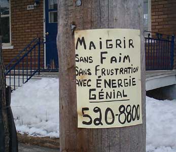 Annonce apposée sur un poteau de téléphone devant le 1470 Bergemont dans la ville de Québec. Photo que j'ai prise le 27 mars 2001 vers 16h30. Pour dire que la compagnie Herbelife leur fait miroiter des revenus faramineux à faire maigrir les gens...